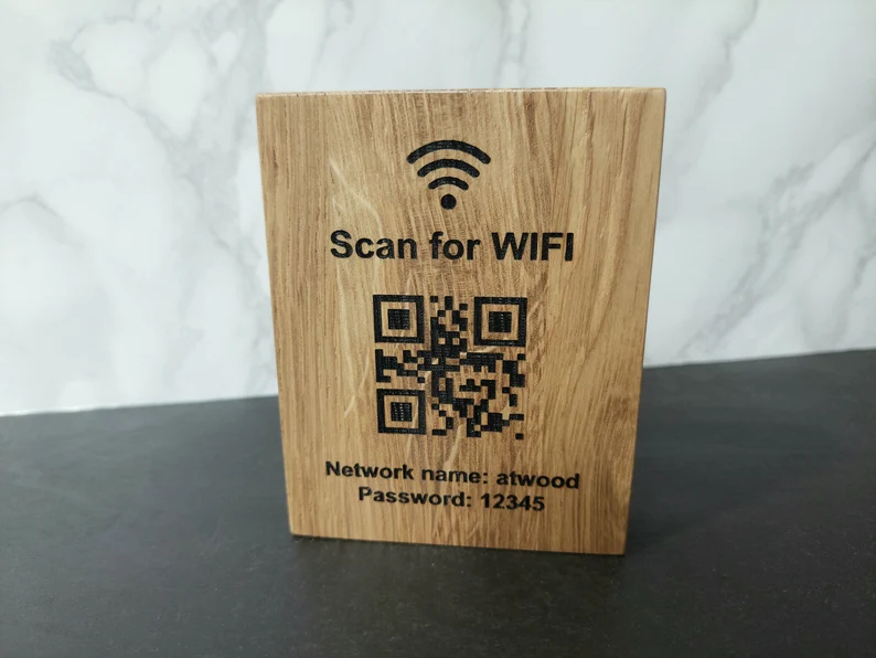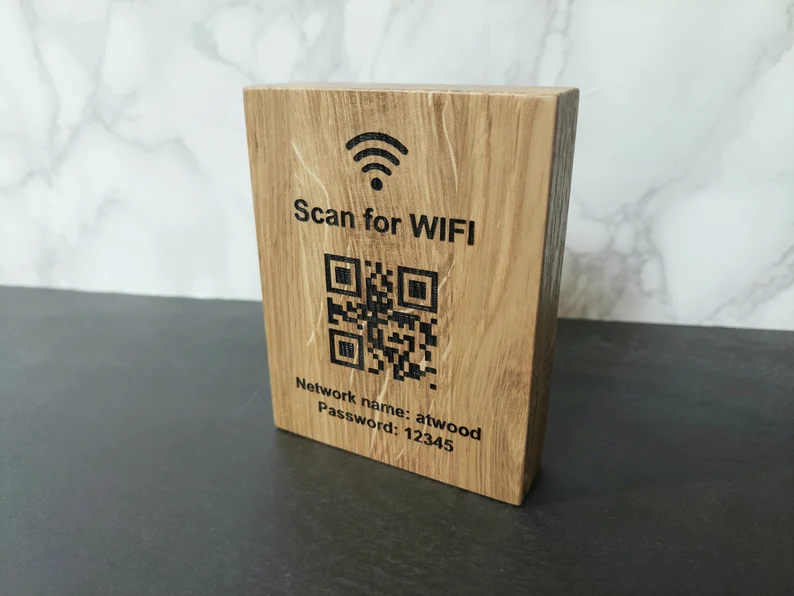 Αναβαθμίστε την εμπειρία των επισκεπτών σας με τον εξατομικευμένο κωδικό QR για Wi-Fi, χαραγμένο σε ξύλο υψηλής ποιότητας.